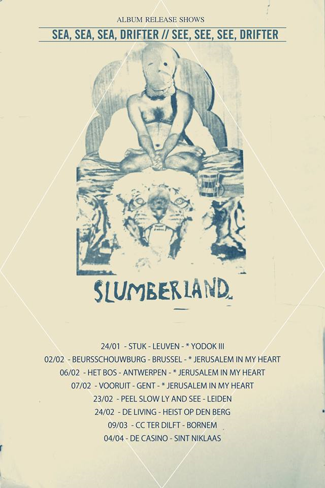 Consouling Sounds en Stuk gaan 2019 duchtig van start met een geweldige en Belgische affiche op donderdag 24 januari: Slumberland is het project van muzikant en filmmaker Jochem Baelus (ex Echo Beatty), tegenwoordig worden de zelfgebouwde mechanische instrumenten aangevuld met drummers Frederik Meulyzer en Alfredo Bravo (Flying Horseman). Voor hun tweede album ‘Sea, Sea, Sea Drifter / See, See, See Drifte‘, dat op 1 februari verschijnt, doken ze in de studio met Radwan Ghazi Moumneh van Jerusalem In My Heart, met uitstekend resultaat.