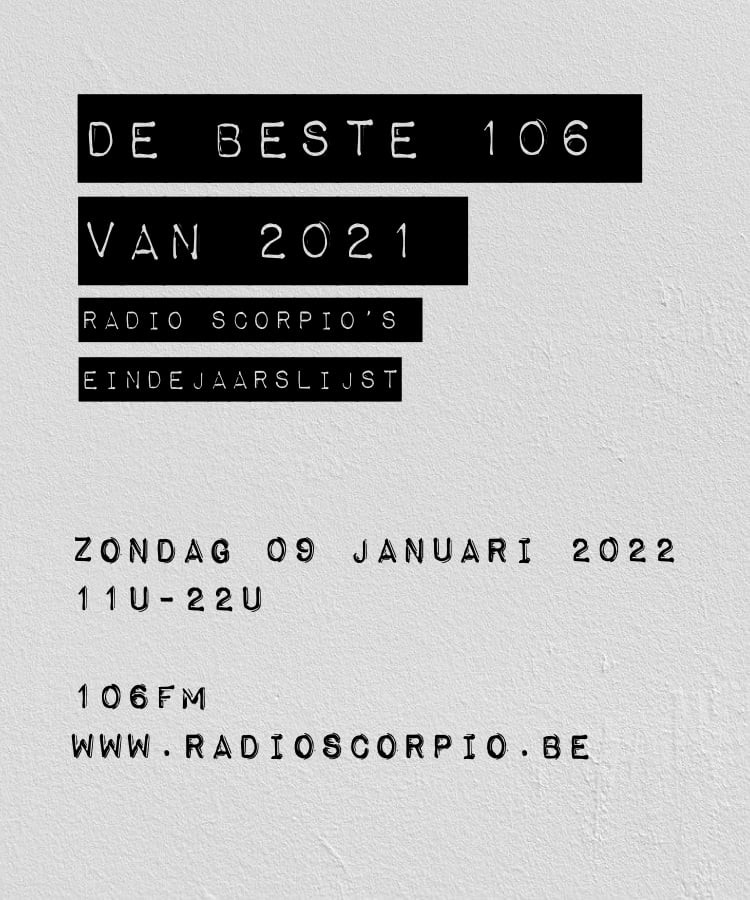Op zondag 9 januari blikt Radio Scorpio naar jaarlijkse gewoonte nog één keer terug op de muzikale hoogtepunten van het voorbije jaar, dit traditioneel met een stevige eindejaarslijst van 106 albums, naar analogie met de frequentie van de radiozender. De lijst wordt helemaal corona-proof gepresenteerd tijdens een marathonuitzending van maar liefst 11 uur.