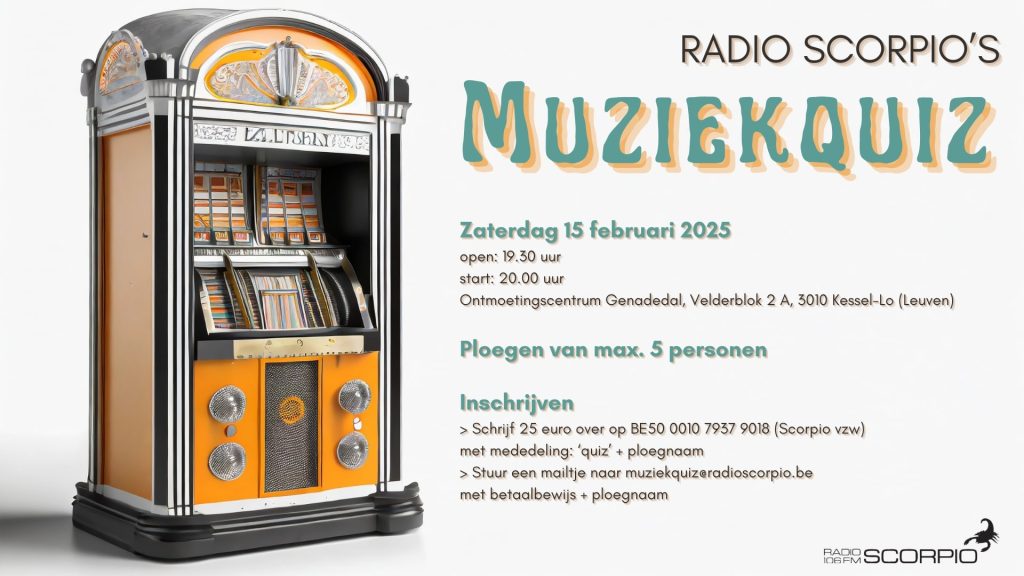 > Schrijf 25 euro over op BE50 0010 7937 9018 (Scorpio vzw) met mededeling: ‘quiz’ + ploegnaam