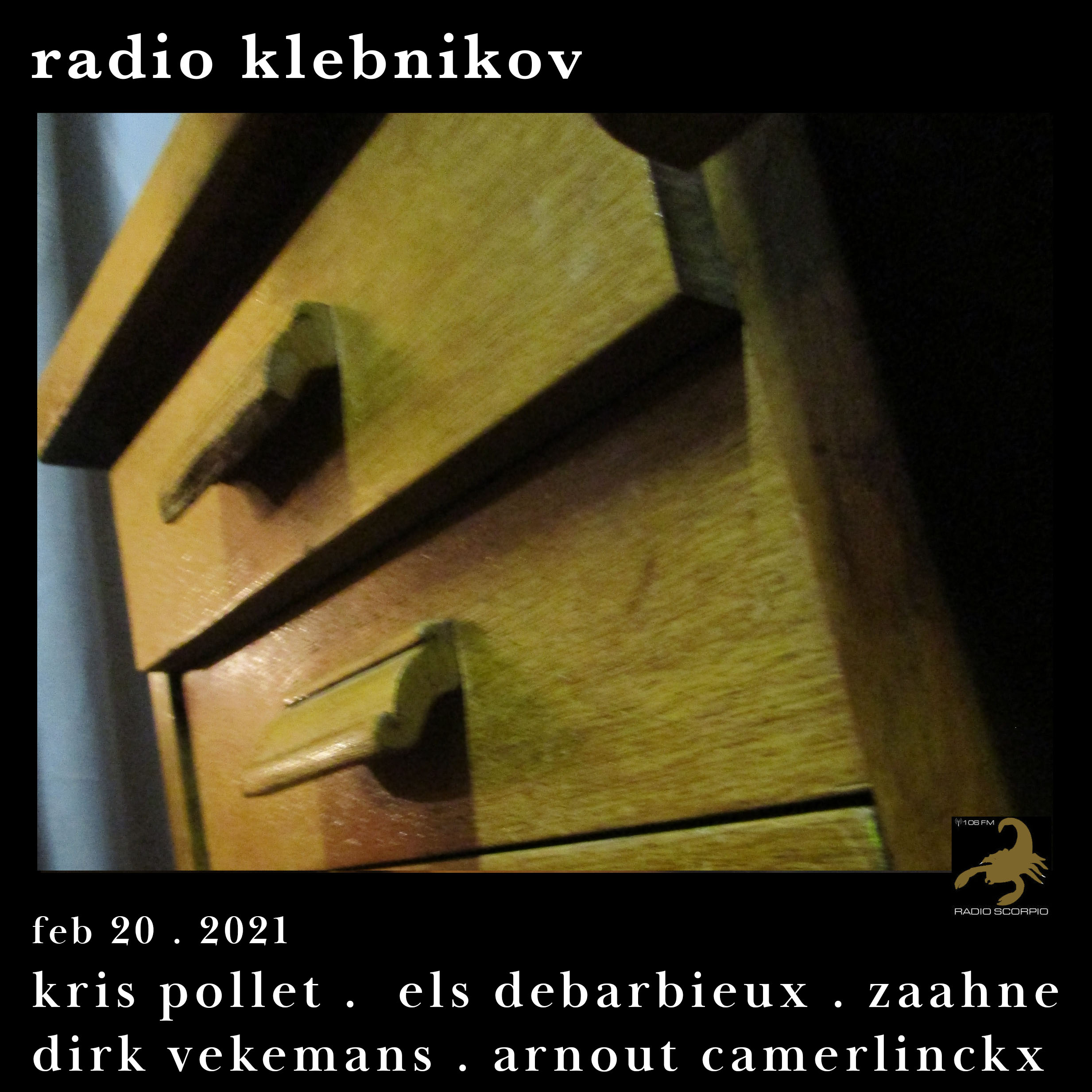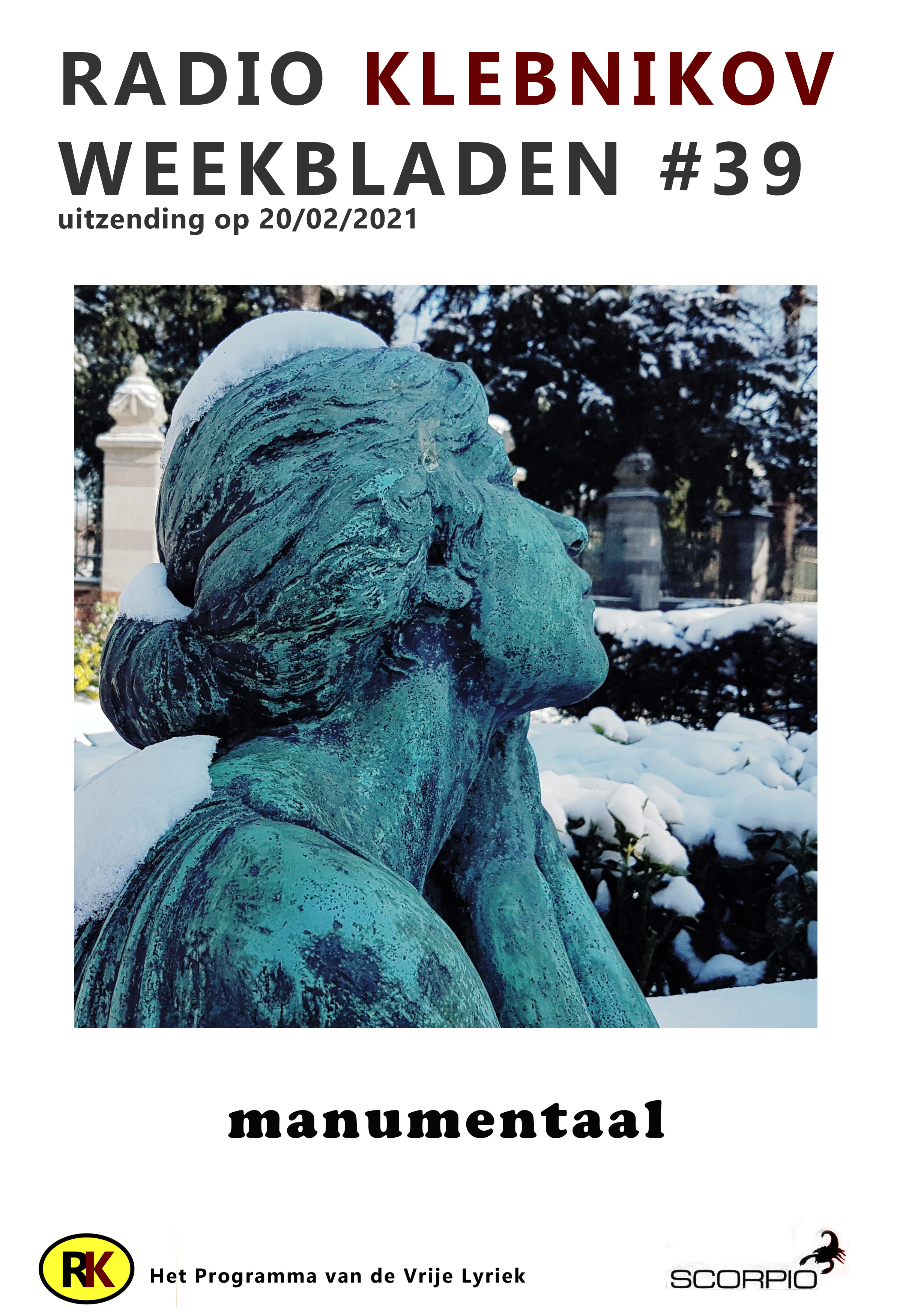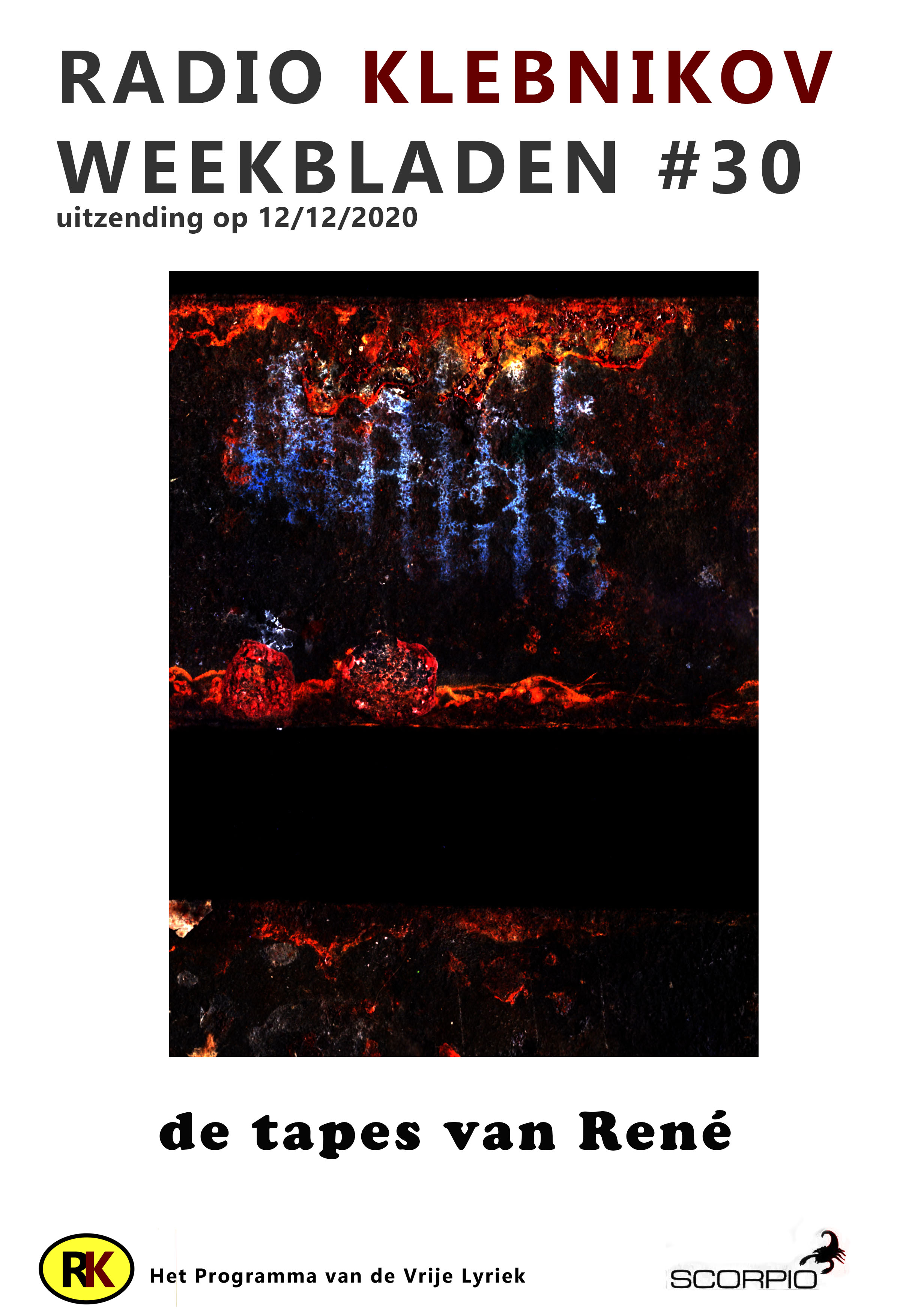 RK WEEKBLADEN = tekstverzameling waaruit geput kan worden tijdens de uitzending van RADIO KLEBNIKOV, het programma van de Vrije Lyriek elke zaterdag 18-20u op Radio Scorpio. Deze week teksten van Anke Veld, David Roden, Guillaume de Machaut, Gustav Davidson, NKdeE, Marije Hendrikx, Petra Fenijn, Robert Henryman, Roberto Ncar en Svetlana Zakharova