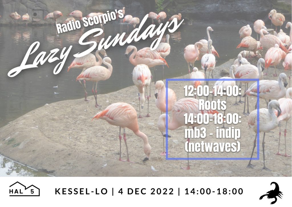 Luister zondag 4 december naar de “chill in Hal 5” DJ-set van Scorpio’s Lazy Sundays tussen 12:00 en 18:00.