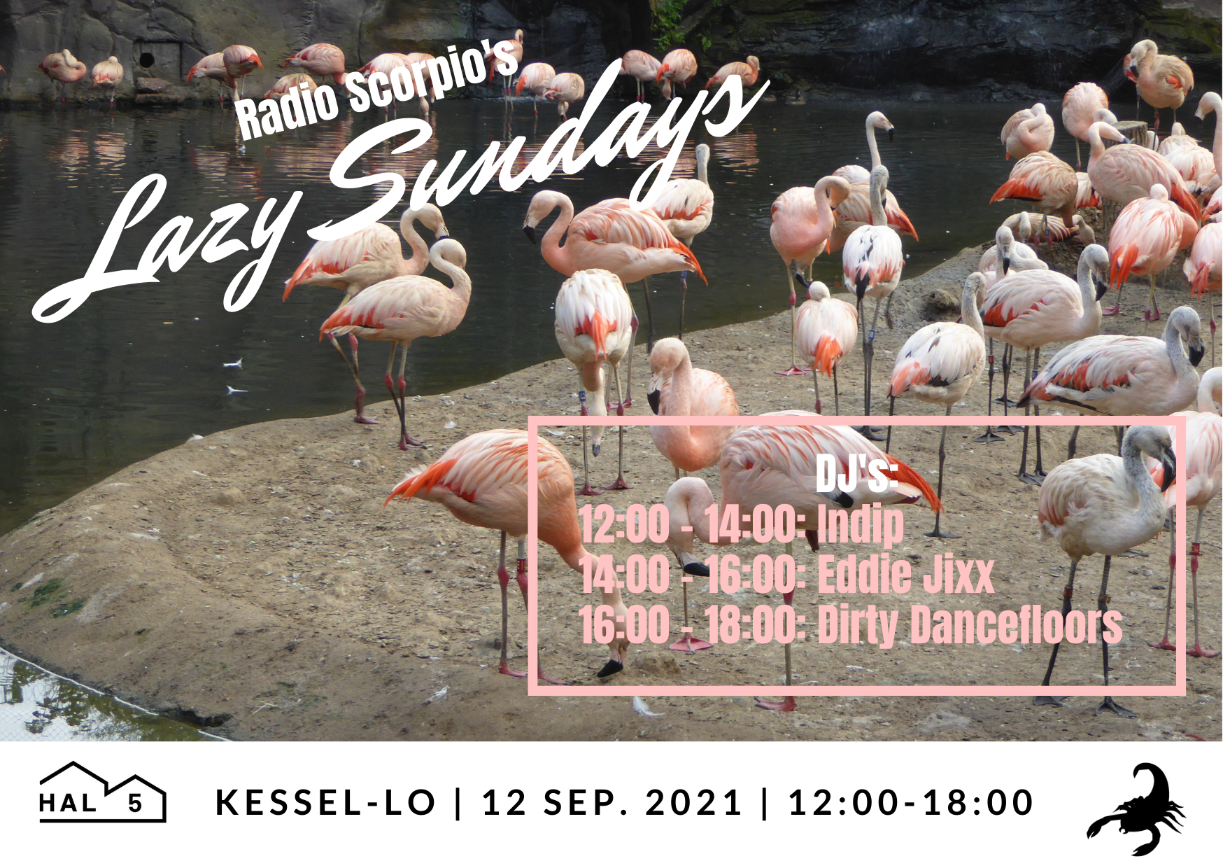 Deze zondag 12 september staan de Scorpio’s Lazy Sundays terug live in Hal 5 tussen 12:00 en 18:00. Kom ff langs voor een aperitiefje of luister via deze link of scan deze QR-code: